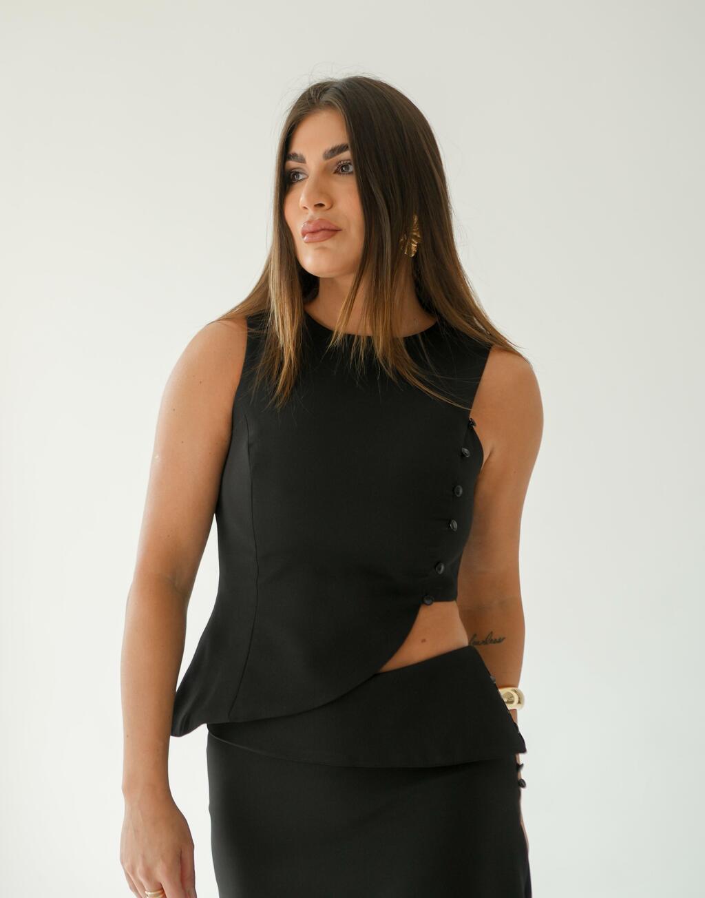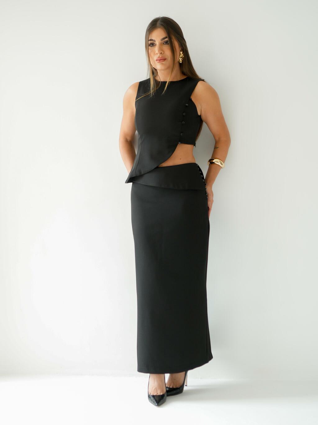 Conjunto de saia longa com pala sobreposta e aplicação de botões na lateral. Blusa com design e recorte assimétrico frontal. Style moderno é a escolha certa para as fashionistas.