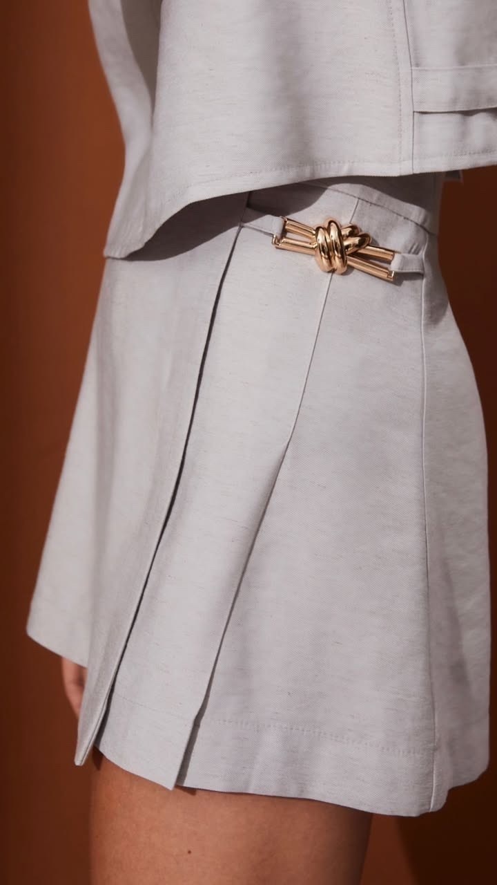 Descubra a beleza e a praticidade do nosso Short Saia com Detalhe Dourado na Lateral. Confeccionada com uma mistura leve de 87% viscose, 8% poliéster e 5% linho, essa peça proporciona um caimento perfeito e um toque macio à pele.